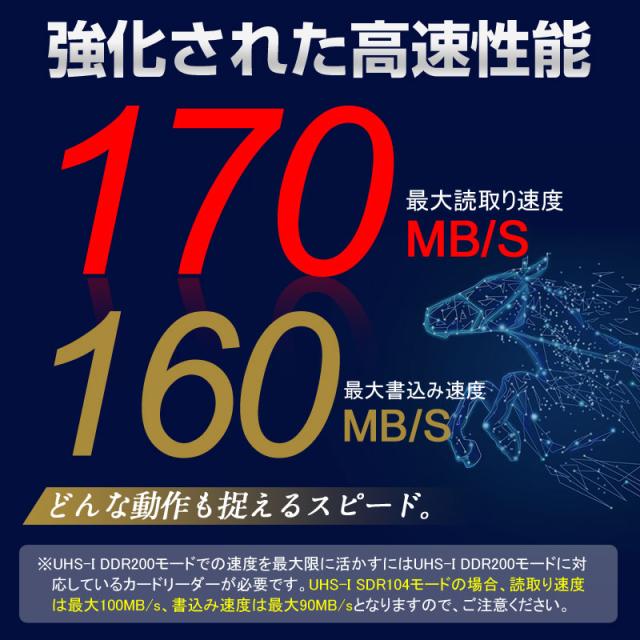 最大転送速度:UHS-I DDR200モード R:170MB/s W:160MB/s;UHS-I SDR104モード R:100MB/s W:90MB/s