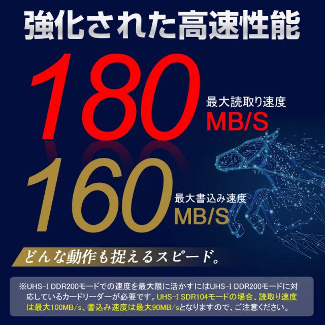 * 最大転送速度:UHS-I DDR200モード R:180MB/s W:160MB/s;UHS-I SDR104モード R:100MB/s W:90MB/s
