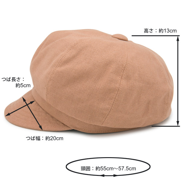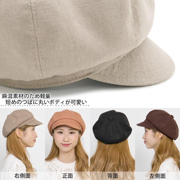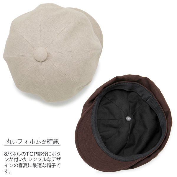 短めのつばにボリュームのある丸いボディが可愛いキャスケットです。麻混素材のため軽量で、頭を疲れさせずにオシャレを楽しませてくれます。8パネルのTOP部分にボタンが付いたシンプルなデザインの春夏に最適な帽子です。普段使いからカジュアルコーデとの相性もよく、幅広い年代の女性にお使いいただけるのではないでしょうか。スベリの内側にはサイズ調整用のマジックテープが付いているため若干のサイズ調整が可能です。