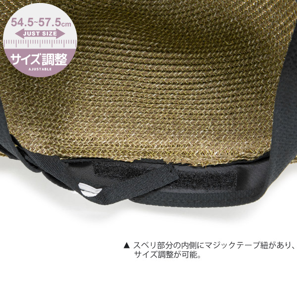 サイズ表記54.5〜57.5cm(頭囲:約55.5〜57.5cm、高さ:約8cm、横幅:約28cm[つばも含む]、つばの長さ:約7cm)