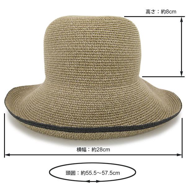 | サイズ | サイズ表記54.5〜57.5cm(頭囲:約55.5〜57.5cm、高さ:約8cm、横幅:約28cm[つばも含む]、つばの長さ:約7cm) |