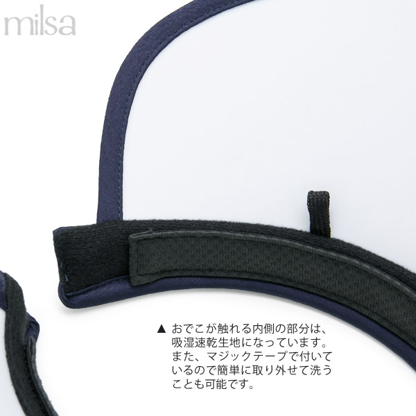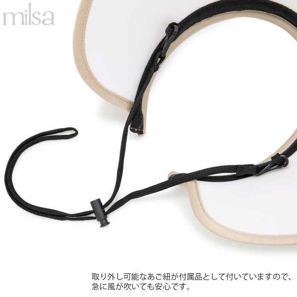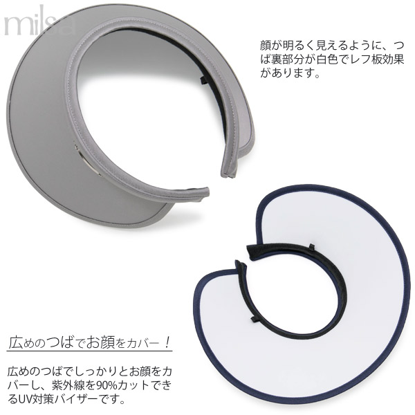 顔が明るく見えるように、つば裏部分が白色でレフ板効果のある美人バイザーの新シリーズを入荷しました。デザインは、光沢のある生地にワンポイントでメタル調のチャームが付いたシンプルでエレガント。頭に挟み込むクリップバイザータイプですが、取り外し可能なあご紐も付属しているので、風の強い日でも安心して被れます。おでこが触れる内側の部分は、吸湿速乾生地になっているので汗をかいてもサラサラと快適に過ごせます。広めのつばでしっかりとお顔をカバーし、紫外線を90%カットできるUV対策バイザーです。