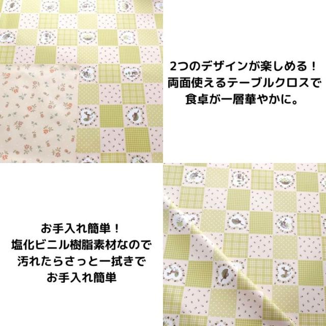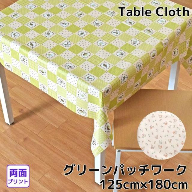 テーブルクロス 撥水 パッチワーク柄 花柄 ビニール リバーシブル 約125×180cm 幅125cm グリーン ベージュ 耐水 防水 おしゃれ お洒落 両面使える リビング ダイニング モダン かわいい 可愛い 北欧 塩化ビニル PVC メール便送料無料 MGR-105 グリーンパッチワーク