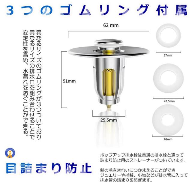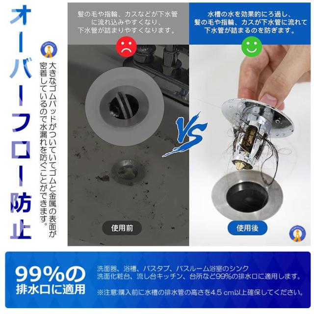 幅広い適用範囲ポップアップ排水栓は水槽の水を効果的にろ過し髪の毛やカスが下水管に流れて下水管が詰まるのを防ぎます。内径27mm-48mmの排水口に適用します。洗面器、浴槽、バスタブ、バスルーム浴室のシンク、洗面化粧台、流し台キッチン、台所など99%の排水口に適用します。高品質スプリングを内蔵し耐久性に優れている。ボタンを押すだけで簡単にポップアップ排水栓を開閉することができます。目詰まり防止ポップアップ排水栓は普通の排水栓と違って詰まり防止用のストレーナーがついています。取り付け簡単送料無料