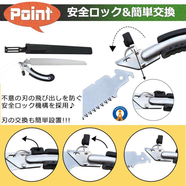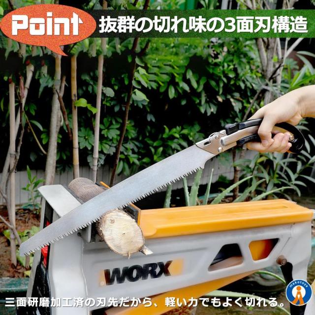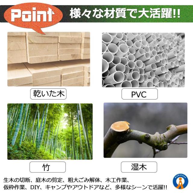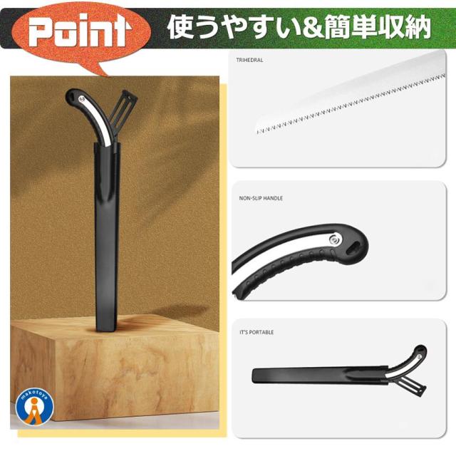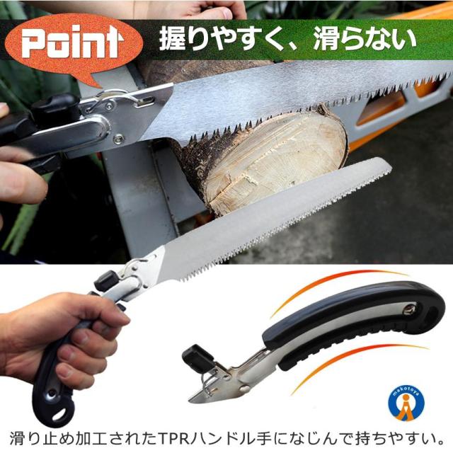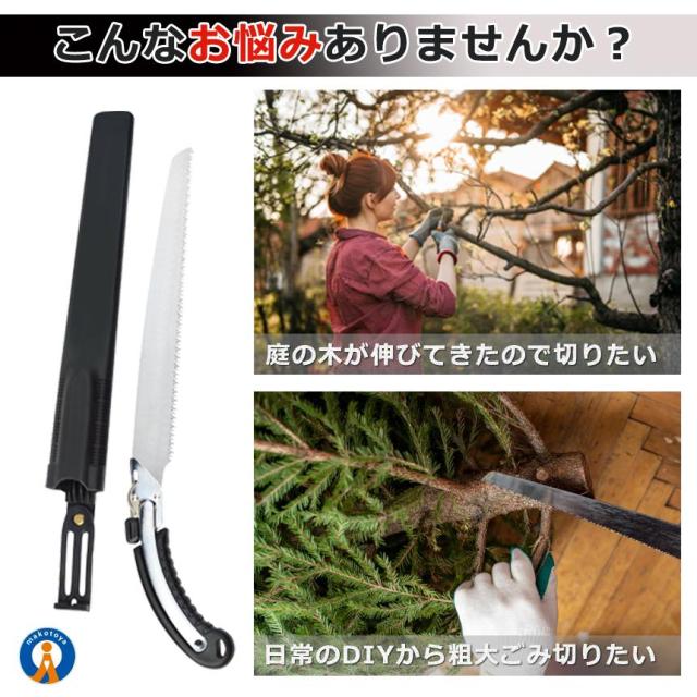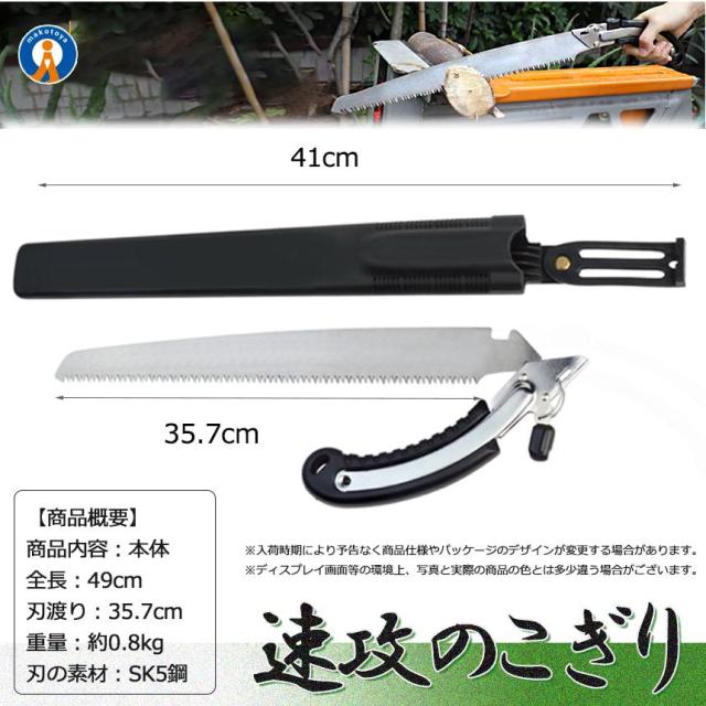 【 切れ味抜群/万能のこぎり 】・三面研磨加工済の刃先だから、軽い力でもよく切れる。・のこぎりに最適なSK5鋼を採用・滑り止め加工されたTPRハンドルだから、手になじんで持ちやすい。・不意の刃の飛び出しを防ぐため、安全ロック機構を採用・生木の切断、庭木の剪定、粗大ごみ解体、木工作業、仮枠作業、DIY、キャンプやアウトドアなど、多様なシーンで活躍【サイズ/重量(約)】全長 :49cm刃渡り:35.7cm【ご留意ください】※ノコギリの刃にゆとりを持たせた状態で到着します。到着後にプラスドライバーで刃の揺らつきが無くなるまでネジを閉めてご利用下さい。※配送により若干スレ、汚れ等が付く場合がございます。予めご了承ください。