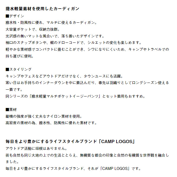 在庫限り 【ロゴス 正規販売店】撥水軽量カーディガン 33512 L CAMP LOGOS ロゴス サンドベージュ アパレル 33512662