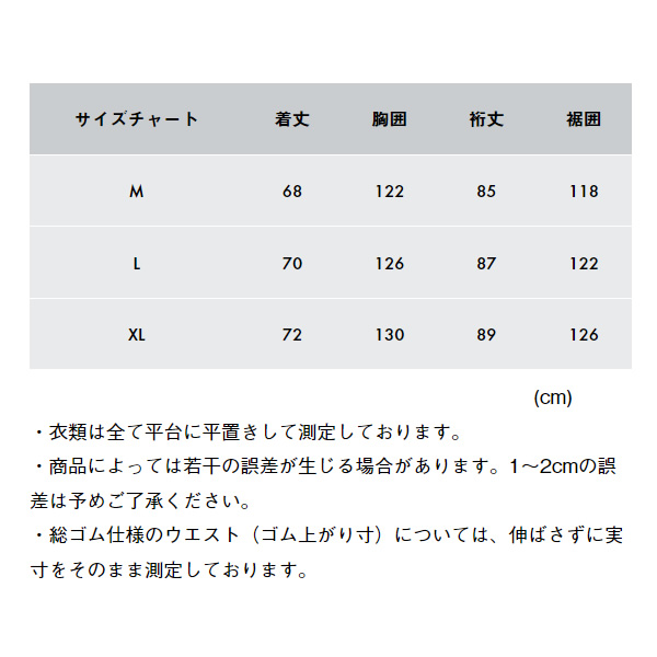 | サイズ(cm) | L:着丈70/胸囲126/裄丈87/裾囲122 |