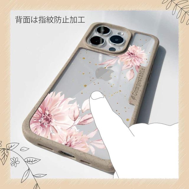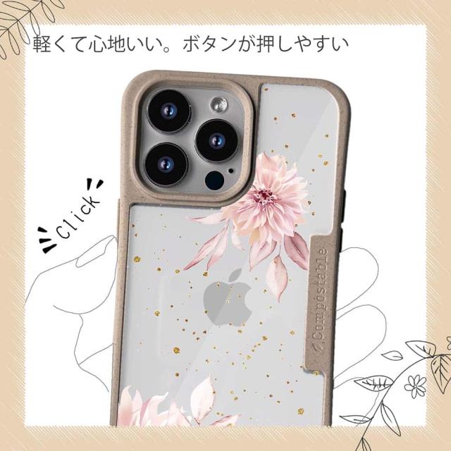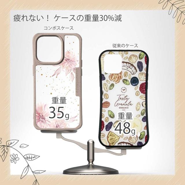 | 注意事項 | コンポスケースは、フレーム部分に「生分解性プラスチック」という環境に優しい素材を使用しております。そのため擦ったり、ぶつけたりする衝撃を与えると脆い部分もあります。耐衝撃ケースではないことをご了承ください。 Qi充電やMagSafe充電にも対応していますが、装着していない時に比べると充電速度は落ちます。 |