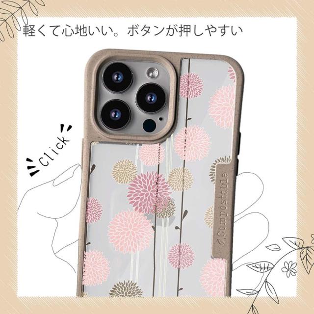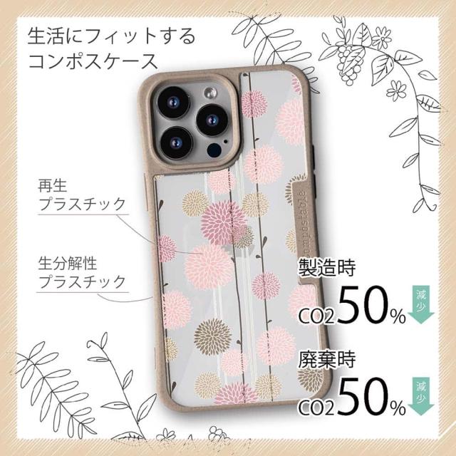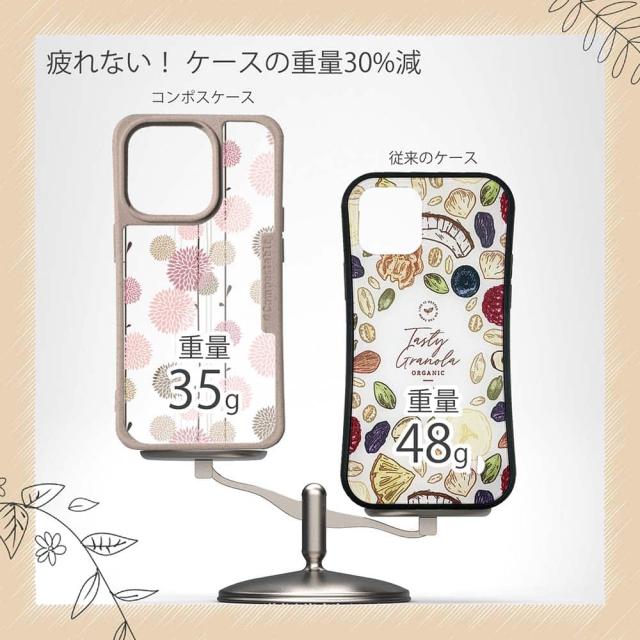 | 注意事項 | コンポスケースは、フレーム部分に「生分解性プラスチック」という環境に優しい素材を使用しております。そのため擦ったり、ぶつけたりする衝撃を与えると脆い部分もあります。耐衝撃ケースではないことをご了承ください。 Qi充電やMagSafe充電にも対応していますが、装着していない時に比べると充電速度は落ちます。 |