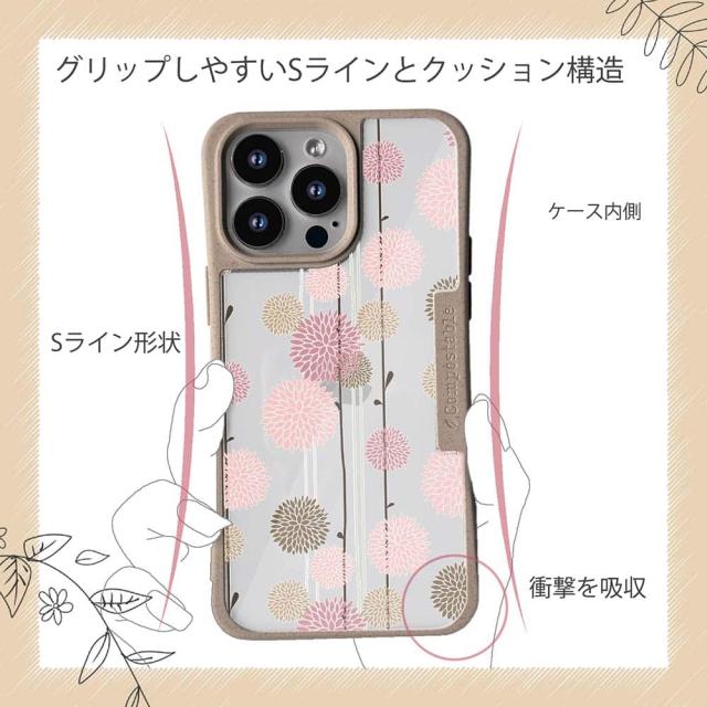 | ケースについて | 背面の内側に入れ込むデザインシートで、シーンに合わせて着せ替え可能。また、グリップしやすいクッション構造で、本体重量は約35gと軽減化を実現。さらにSライン形状で、究極に押しやすいボタン設計(切り込みが入ることで押し込む力を軽減)、背面のカメラ・レンズを保護する高さ設計となっております。生分解性プラスチック素材ながらも着脱もしやすく、割れない・指紋防止加工を施しています。 |