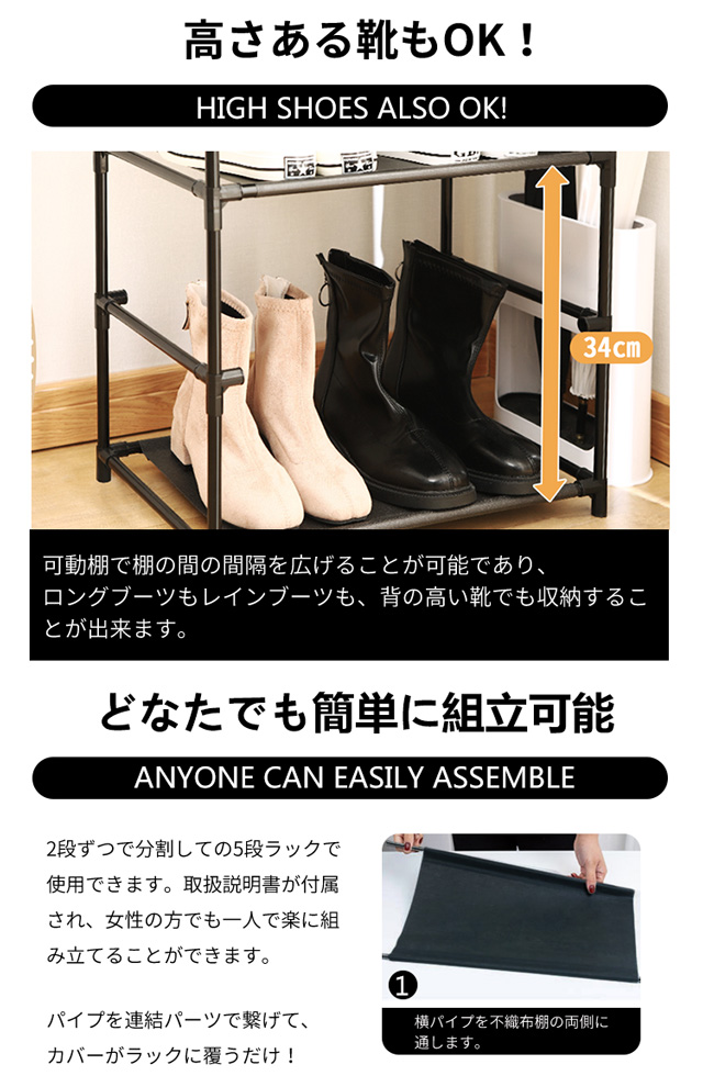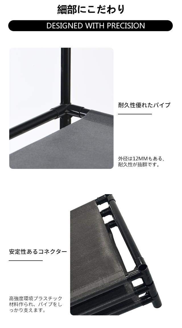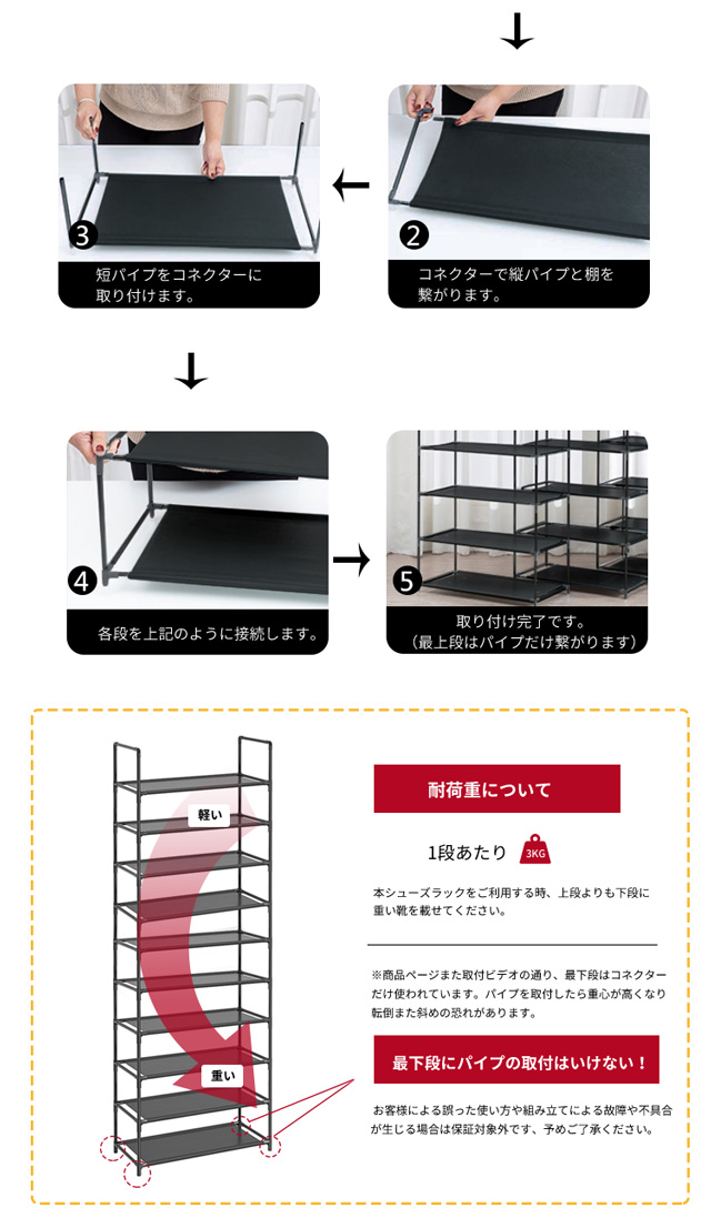 2段ずつで分割してのお好きな段ラックで使用できます。工具を要らず、パイプをジョイントに差し込めば完成し、男女兼用で操作しやすいです。分解した後に畳んで省スペースで収納できます。