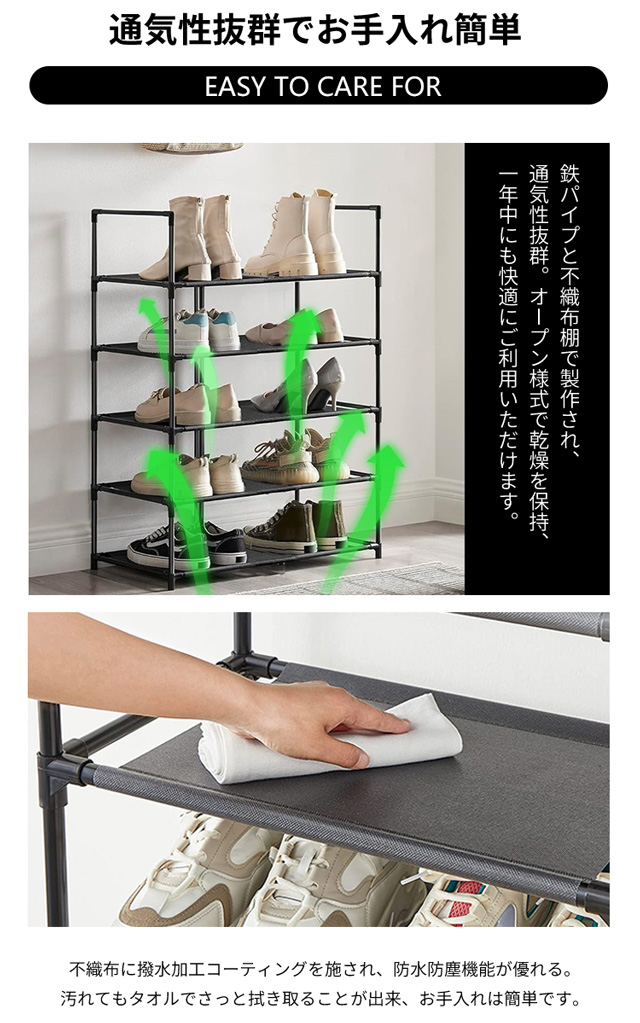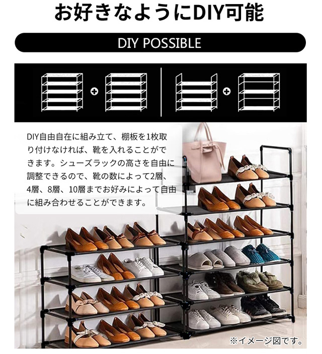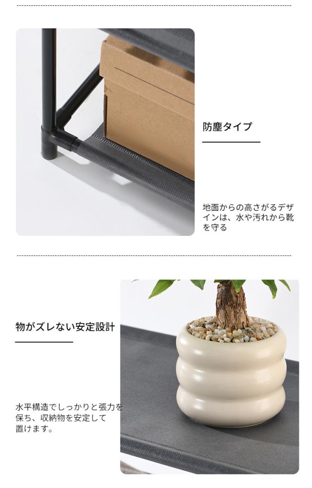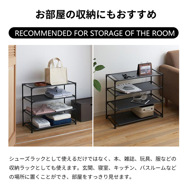 シューズラックとして使えるほか、本、雑誌、子供の玩具、服などの収納ラックとしても使え、同時に玄関、寝室、キッチン、バスルームなどの場所に置くことができ、部屋をすっきり見せます。