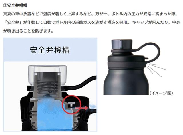 真夏の車中放置などで温度が著しく上昇するなど、万が一、ボトル内の圧力が異常に高まった際、「安全弁」が作動して自動でボトル内の炭酸ガスを逃がす構造を採用。 キャップが飛んだり、中身が噴き出ることを防ぎます。