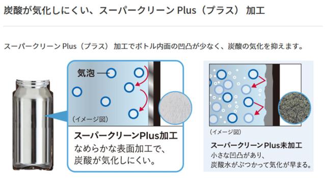 スーパークリーンPlus(プラス)加工でボトル内面の凹凸が少なく、炭酸の気化を抑えます。