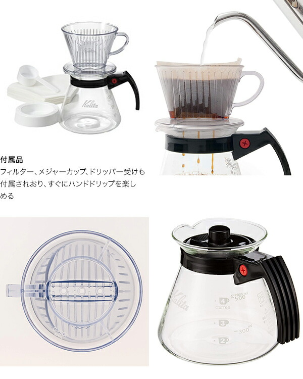 2~4人用のドリッパーとサーバーのセットです。 ろ紙もセットになっていますので、そのままお使いいただけます。 ギフトにも最適です。 【ハンドドリップで、リッチなコーヒーブレイクを】 ハンドドリップに必要な珈琲器具をワンセットにしたのが、ロトセット。ドリッパー、フィルター、ガラスサーバー、メジャーカップ、ドリッパー受けがセットされている 【3つ穴のコーヒードリッパー】 軽くて丈夫な扱いやすいプラスチックドリッパー 抽き出したコーヒーをドリッパー内にためずに、自然に滴下させる3つ穴のコーヒードリッパー。また、内側に伸びた長いミゾは、濾紙のはりつきをセーブして濾過を助け、コーヒーをサーバーへ導く役目をしている 雑味がでる前に美味しさだけをドリップするのでカリタの3つ穴はおいしさが違う 【電子レンジ可の耐熱ガラスサーバー】 カリタのサーバーは、長年の間、コーヒーのプロに適用された耐熱ガラス製品 ハンドルは耐熱性のあるポリプロピレンを使用 手軽に本格的なおいしさをお楽しみいただける 【付属品】 フィルター、メジャーカップ、ドリッパー受けも付属されおり、すぐにハンドドリップを楽しめる |