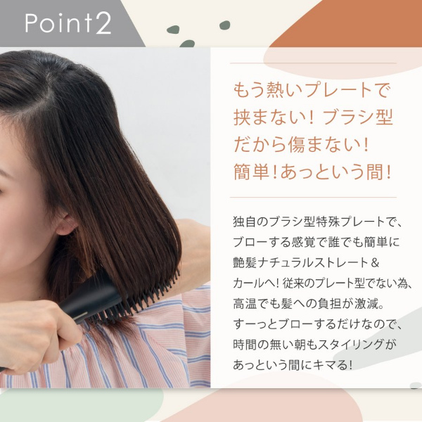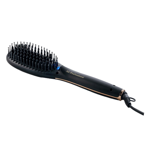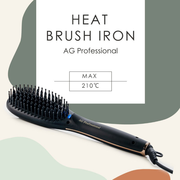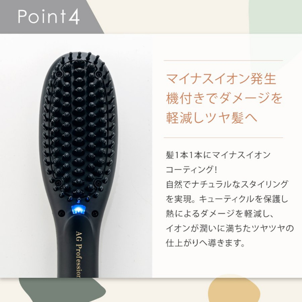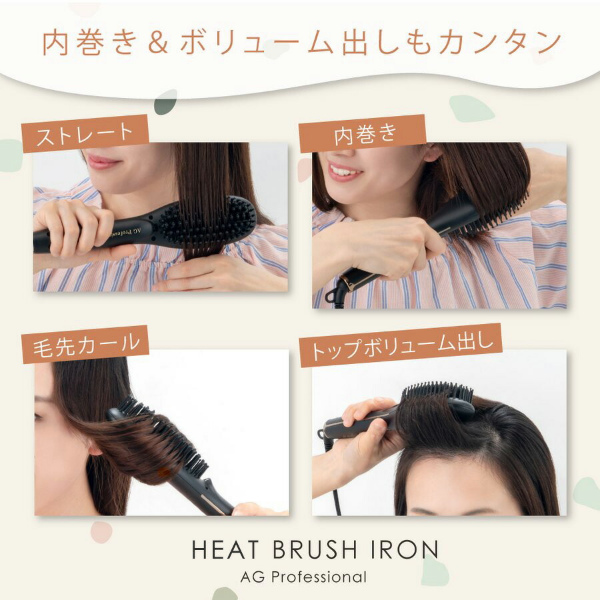 ブラシ型ヘアアイロン「AG プロフェショナル ヒートブラシアイロン」。髪通りを考慮した楕円形状のピンがスタイリング時の髪への摩擦を軽減。更にブラシ下部からマイナスイオンを発生し、髪へのダメージを軽減しながらツヤのある髪へとスタイリングしていきます。ブローする感覚で誰でも簡単に艶髪ナチュラルストーレート&カール!イオンをまとい潤いに満ちたツヤツヤの仕上がりへ導きます。うねった髪も頑固な寝ぐせも瞬時に潤艶リセットさせます。海外対応(変換プラグは別途必要です)