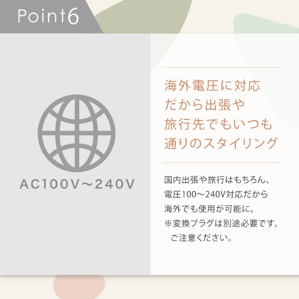 【本体サイズ(約)】258×57×46mm【本体重量(約)】385g(コード含み)【コード長さ(約)】2.5m【電源】AC100Vー240V【消費電力】46W【温度調節】160〜210℃(ボタン式6段階温度調節)【保証期間】購入日より1年間