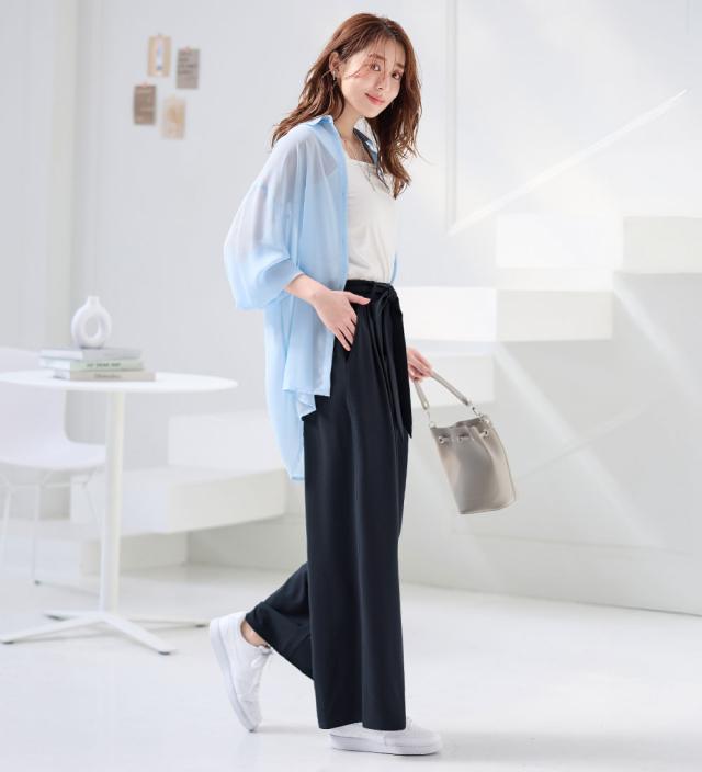 ■素材:■ 品質/ポリエステル95%・ポリウレタン5%、● ウエスト後ゴム使い、● ポケット有、● ベルト通し付、● 共布ベルト付、、【嬉しい4つの機能付】、<UV対策>紫外線からお肌を守ります!、<吸水速乾>汗ばむ季節もベタつきにくく、爽やかな肌ざわり。、<接触冷感>ふれた瞬間、肌にヒンヤリ。、<抗菌防臭>気になる臭いに安心感♪(※全ての菌に対する効果ではありません) 、、………………………………………、透け感:なし、厚さ:普通、伸縮性:あり、裏地:なし、ポケット:あり、………………………………………