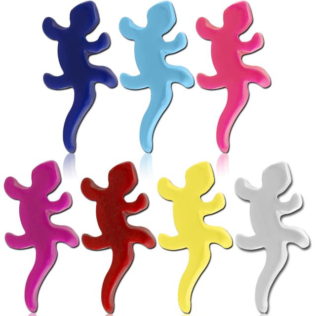 アクリル樹脂素材で作られた14ゲージのネジ式のボディピアスのシャフトに使えるトカゲをデザインしたキャッチパーツ単品。青色ブルー、水色ライトブルー、ピンク色、紫色パープル、赤色レッド、白色ホワイト、黄色イエローのカラーが選べる蜥蜴のキャッチです。
