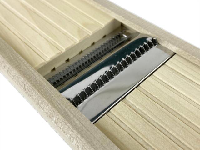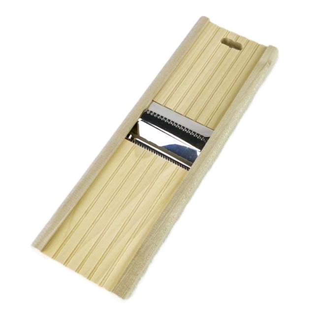 溝付きで野菜がぶれず、安定して調理ができる木製のスライサーです。サラダやしりしり用の野菜を、簡単に素早く切ることができます。