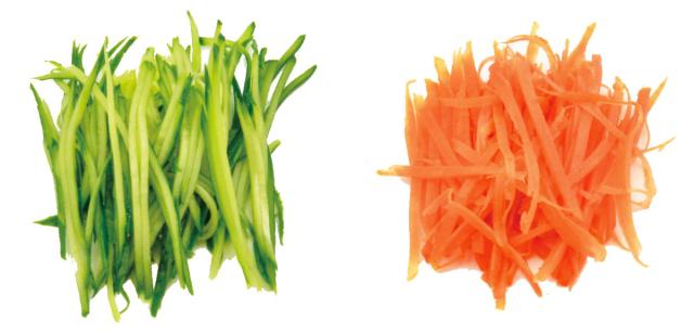 スライサーは裏表に2種類の刃がついており、1枚で太さの違う千切りができます。料理に合わせて使い分けできます。