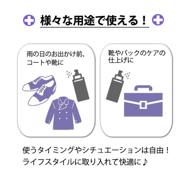 ・靴のホコリや汚れを落とした後20cm〜25cm離して表面が軽く濡れる程度にスプレーして下さい。