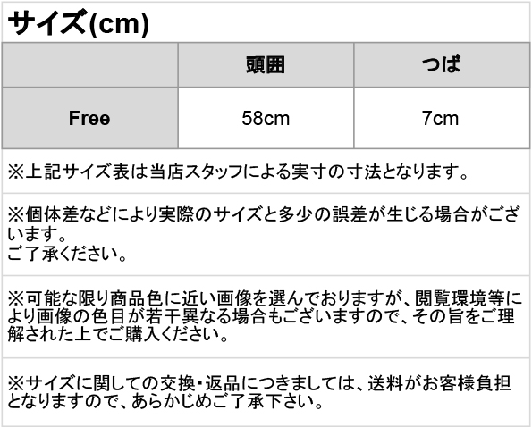 商品タグに[F]表記,[58cm]表記のものがございますが、どちらも調整ベルト最大時、頭囲58cmとなります。