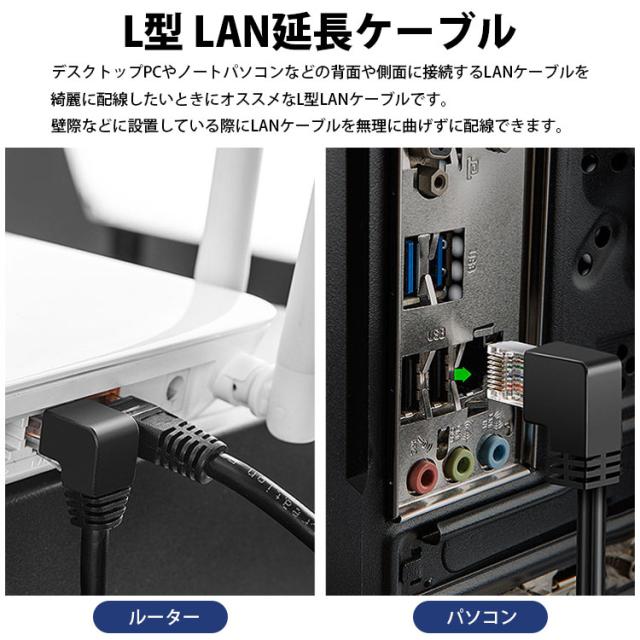 デスクトップPCやノートパソコンなどの背面や側面に接続するLANケーブルを綺麗に配線したいときにオススメなL型LANケーブルです。