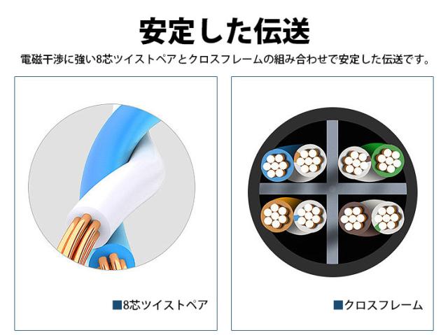 電磁干渉に強い8芯ツイストペアとクロスフレームの組み合わせで安定した伝送です。