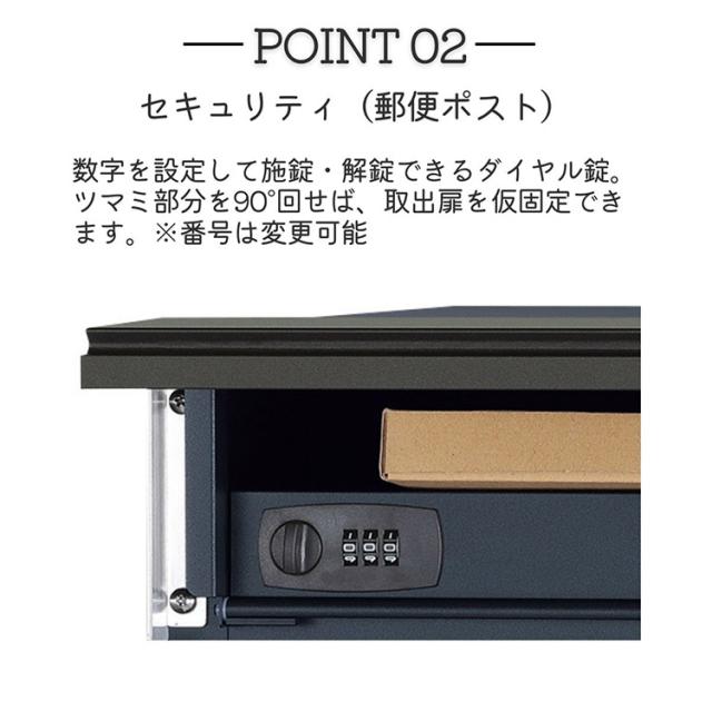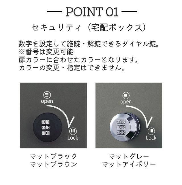 ●宅配ボックス数字を設定して施錠・解錠できるダイヤル錠です。※番号は変更可能。※宅配ボックスのダイヤル錠は扉カラーに合わせたカラーとなります。カラーの変更・指定はできません。