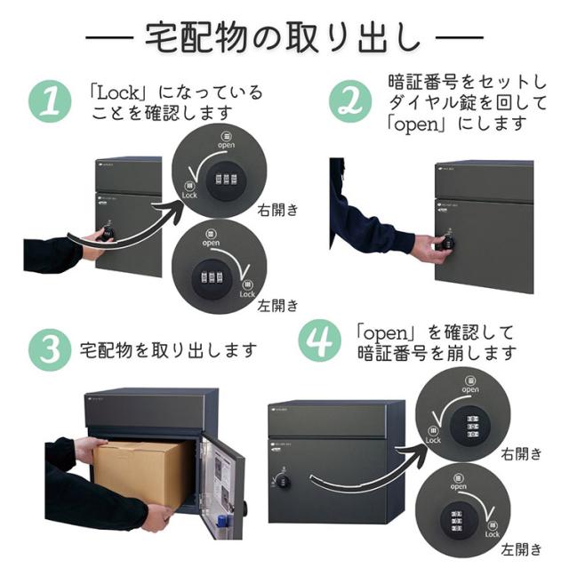 1.「open」になっていることを確認し、扉を開けます。「Lock」の場合は、受け取りができません。