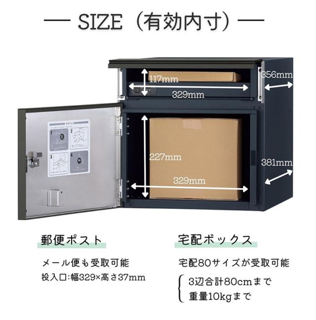 ●宅配ボックス(有効内寸:幅329×高さ227×奥行381mm)ダンボールの規格サイズでは、宅配80サイズ(3辺の合計が80cm)まで、重量は10.0kgまで荷物が受け取れます。