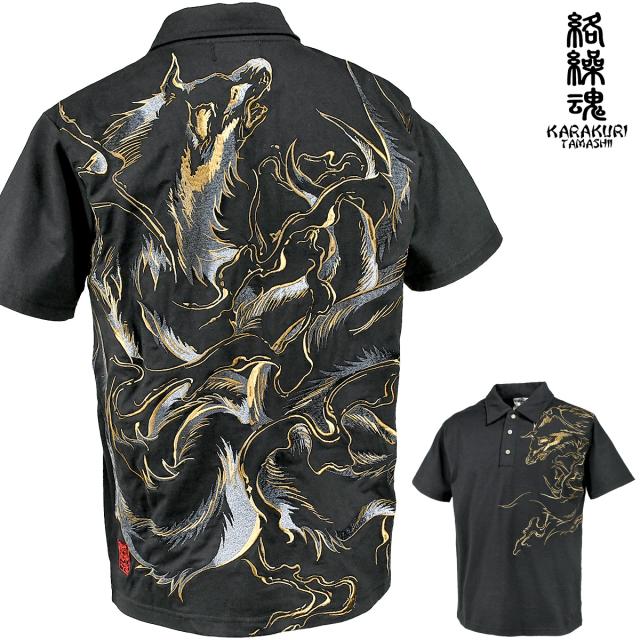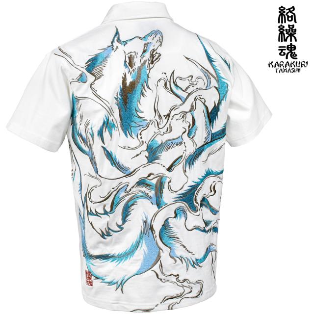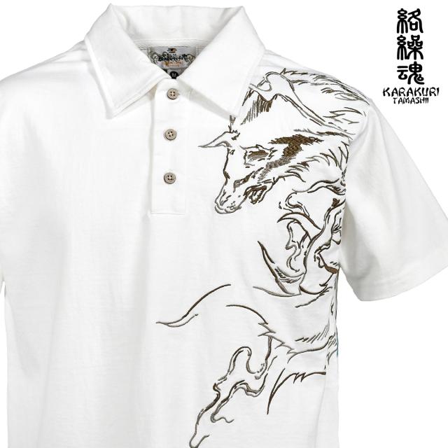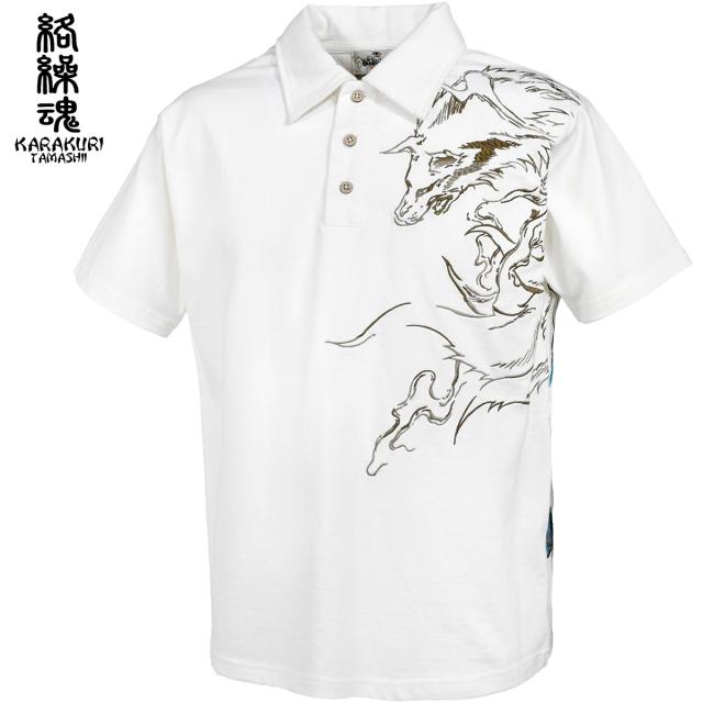 からくり魂 絡繰魂 ポロシャツ 半袖 九尾 狐 和柄 刺繍 メンズ mens ファッション(ホワイト白) 232041