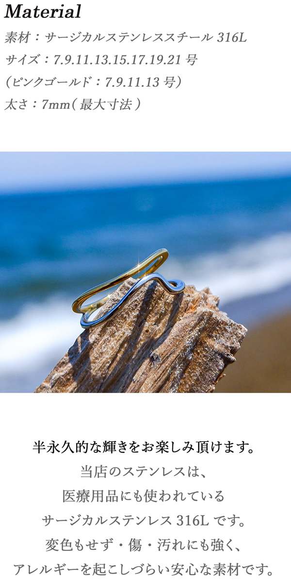 当店のステンレスは、医療用品にも使われているサージカルステンレス316Lです。変色もせず・傷・汚れにも強く、アレルギーを起こしづらい安心な素材です。 半永久的な輝きを演出します!