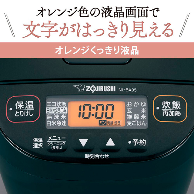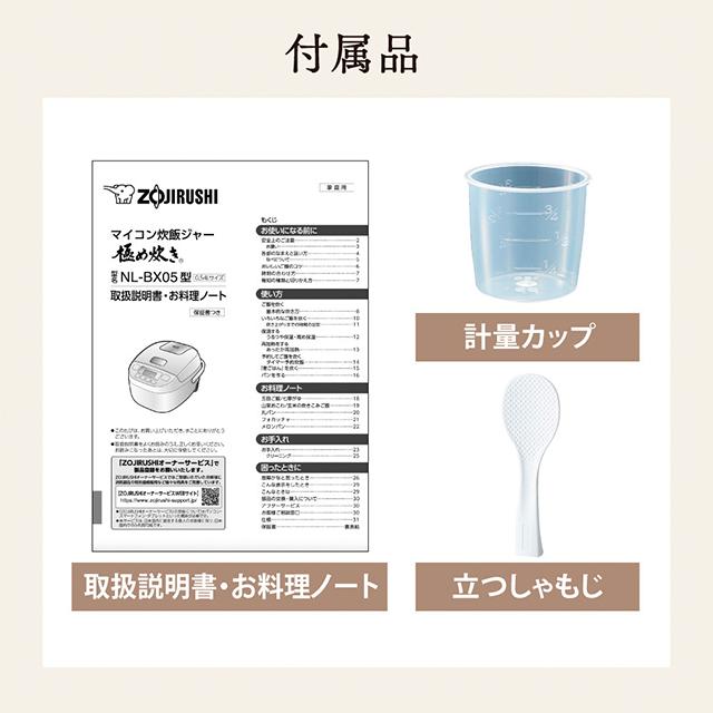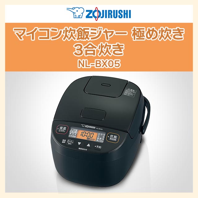 商品名 象印 マイコン炊飯ジャー3合炊き NL-BX05-BA メーカー 象印マホービン株式会社 メーカー型番 NL-BX05-BA カラー ブラック メーカー保証期間 1年 炊飯容量(白米L) 0.09~0.54(0.5~3合) 炊飯時消費電力(W) 495 1回あたりの炊飯時消費電力量(Wh) 93.9(消費電力量は、炊飯量、ご使用メニュー等によって異なります。) 外形寸法 幅×奥行×高さ(約cm) 23.5×32.5×19.5 ふた開き時の高さ(約cm) 36.5 質量(約kg) 3.1 年間消費電力量 38.1kWh/年(エコ炊飯)