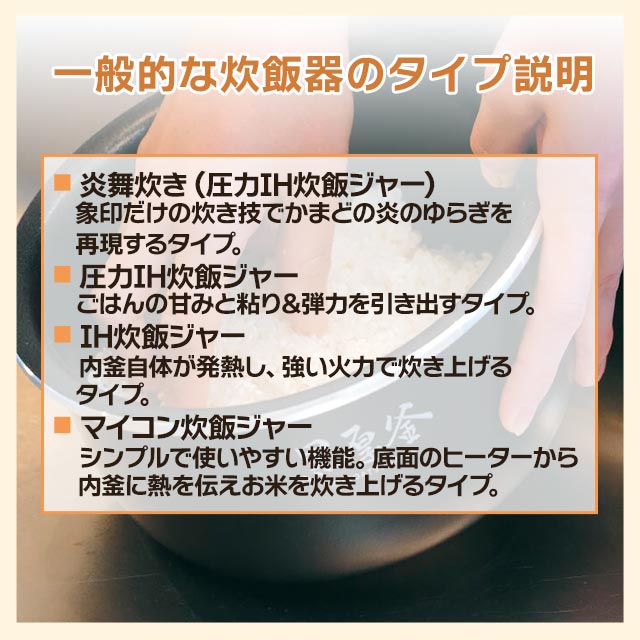 ・メニュー:エコ炊飯、白米、炊きこみ、無洗米、白米急速、おかゆ、玄米、雑穀米、麦ごはん
