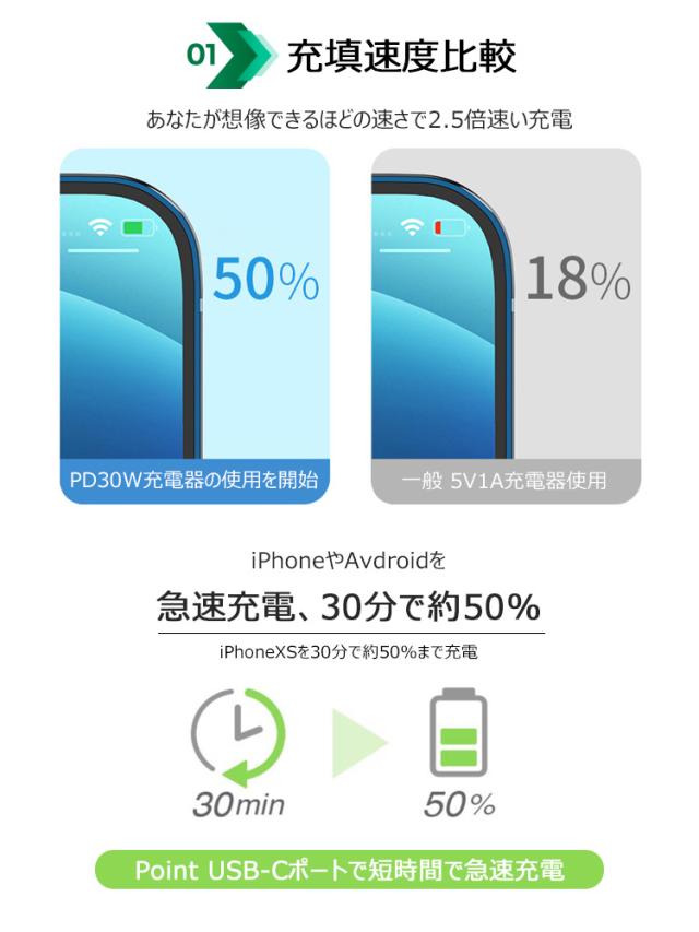 ・PD(パワーデリバリー)搭載。最大30Wの急速充電対応。