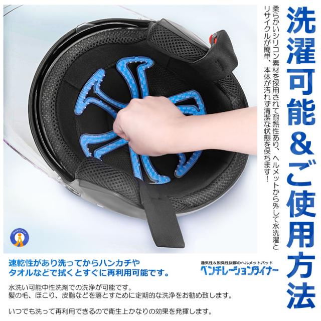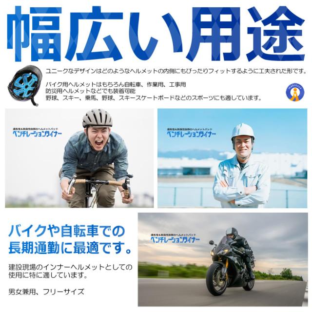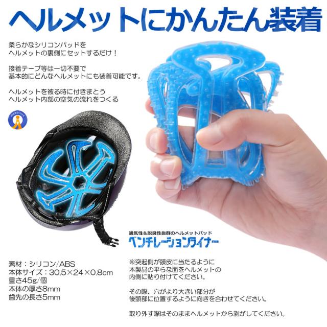 ヘルメットにかんたん装着柔らかなシリコンパッドをヘルメットの裏側にセットするだけ!接着テープ等は一切不要で基本的にどんなヘルメットにも装着可能です。頭部にこもる熱、汗、潰れてします髪、匂い、これらの問題を軽減します。ヘルメットの内側に貼り付ける事によってベンチレーション機能を発揮します。頭蒸れずにスッキリ快適です。通気性・脱臭ヘルメットと頭皮の間に物理的な空間を作り出しヘルメット内部に空気の流れを生みだします。バイクや自転車での長期通勤に最適です。建設現場のインナーヘルメットとしての使用に特に適しています。男女兼用、フリーサイズ送料無料