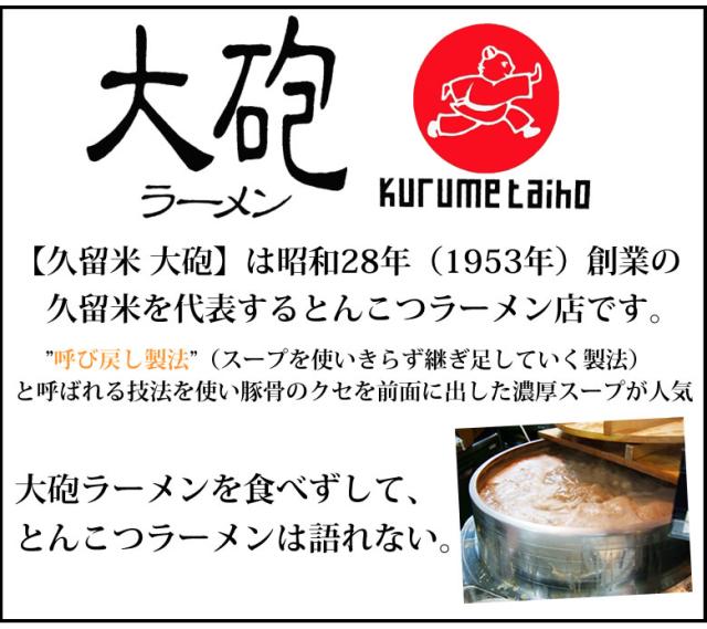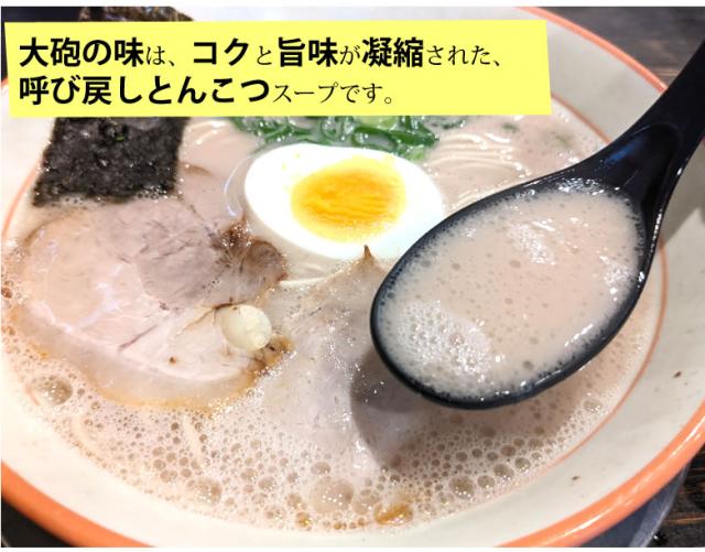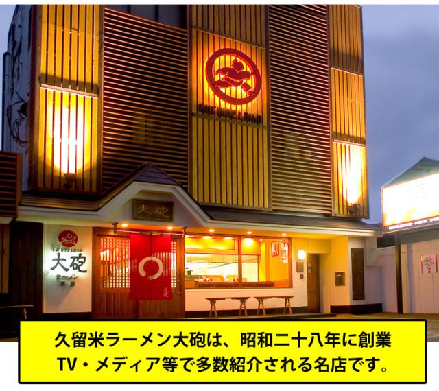 【久留米 大砲】は昭和28年(1953年)創業の久留米を代表するとんこつラーメン店です。 ”呼び戻し製法”(スープを使いきらず継ぎ足していく製法)と呼ばれる技法を使い豚骨のクセを前面に出した濃厚スープが人気 大砲ラーメンを食べずして、とんこつラーメンは語れない。