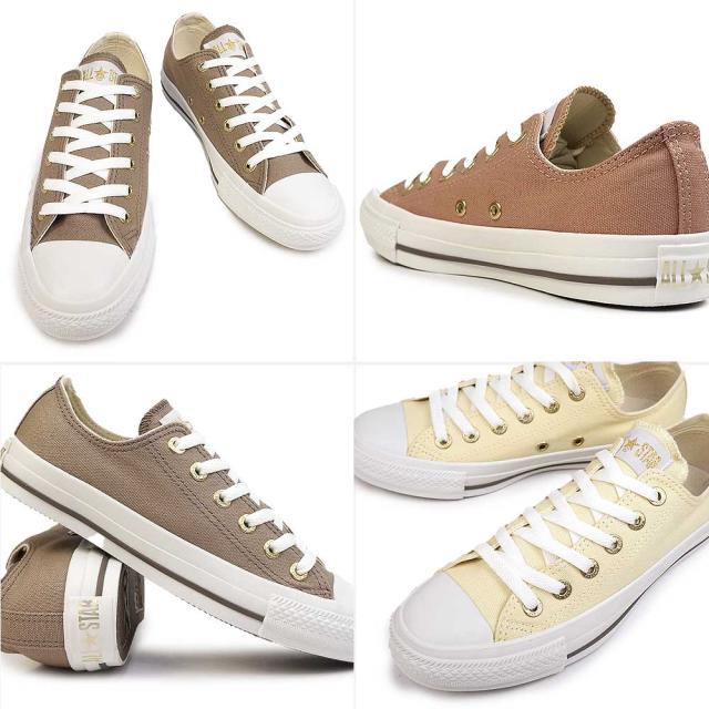 オールスターのディテールアレンジモデル。上品な印象のシャンパンゴールドをハトメ、織りネーム、ヒールラベルにポイント使いしたアイテム。柔らかな印象のピンクベージュ、クリーム、トープの3カラー展開。軽量性に優れ、柔らかめの硬度のE.V.A.インソールを採用。レディースモデルらしいシルエットとソールテープのトープカラーラインが上品なモデルです。
