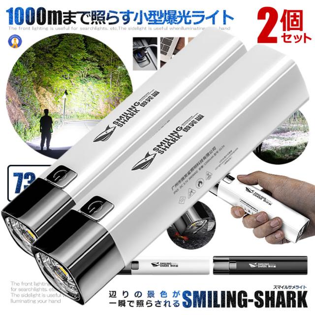 2個セット 懐中電灯 充電式 LED 3つの点灯モード USB充電 強力 ハンディライト 小型 ledライト ビーム距離 200m 簡単充電 軽量 爆光り コンパクト スマイルサメライト SMAILER防災 災害 SMAILER-WH