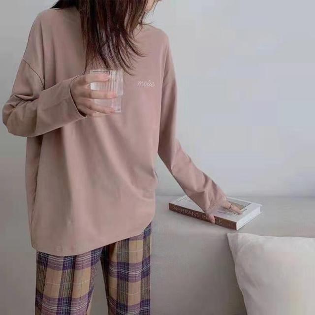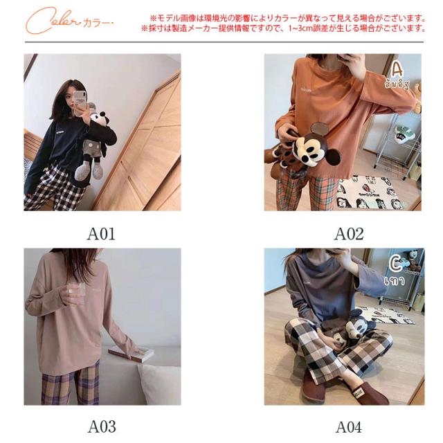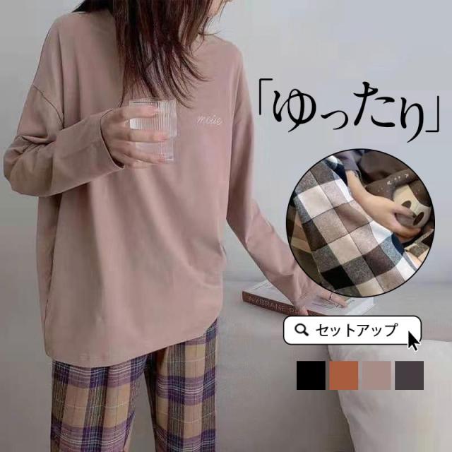 パジャマ レディース ルームウェア セットアップ 上下セット 長袖 ゆったり 春秋 薄手 通気 Tシャツ 長ズボン チェック柄 ナ