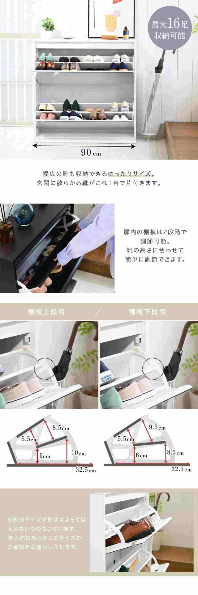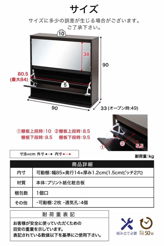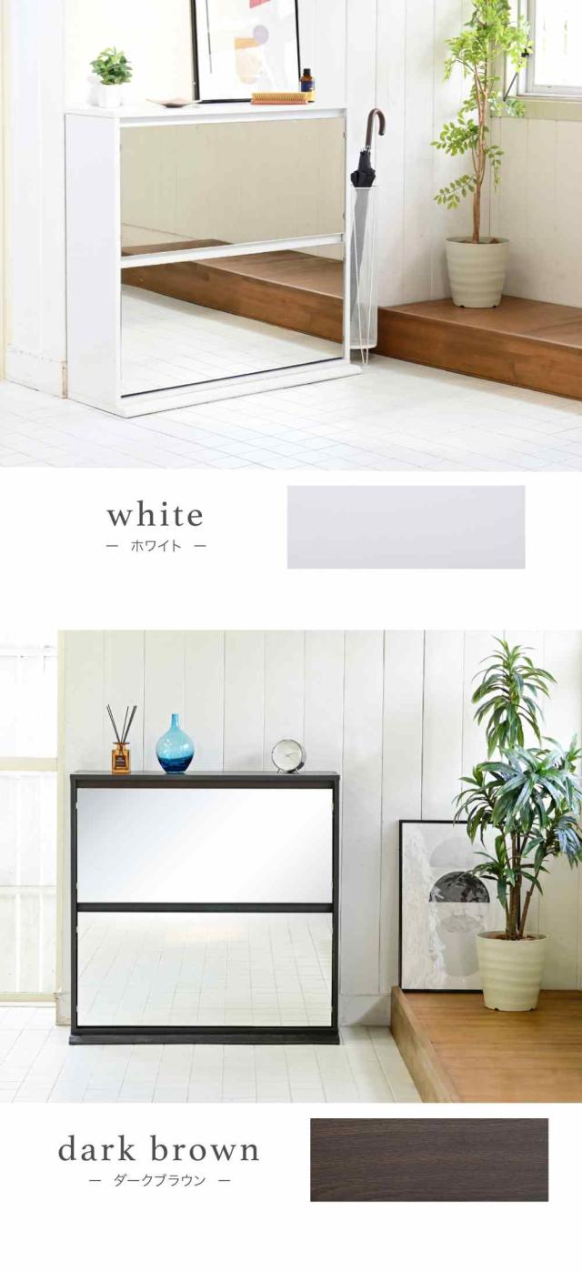 シューズラック スリム シューズボックス 下駄箱 収納 白 靴箱 ミラー 付き フラップ扉 薄型 玄関収納 省スペース 2段 幅90 cm