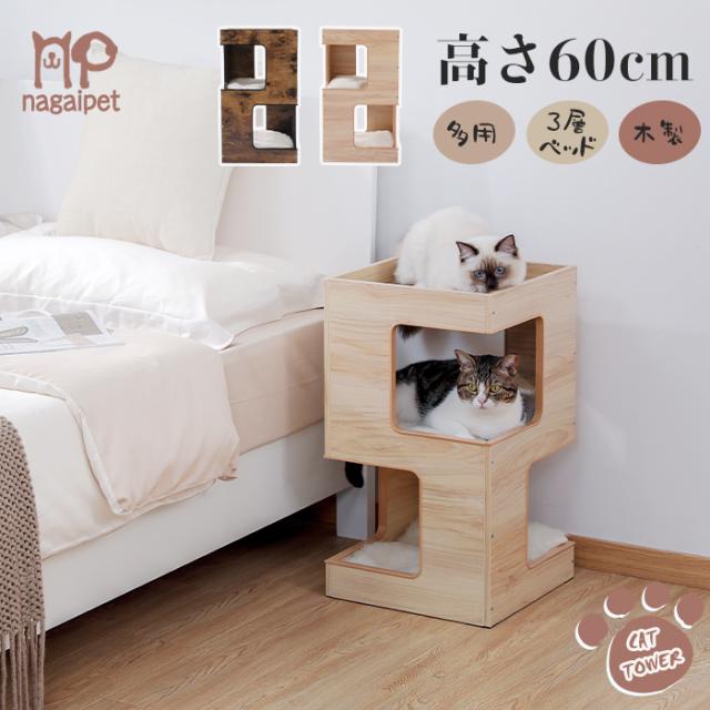 送料無料 キャットタワー 木製 猫タワー 木目調 猫ベッド 猫ハウス 爪とぎダンボール 爪研ぎマット付属 クッション付き 据え置きタイプ おもちゃ付き 家具 インテリア コンパクト 三階 3層 高さ60cm