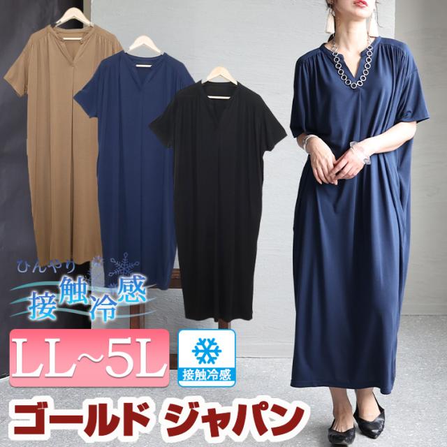 春新作 大きいサイズ レディース ワンピース 接触冷感コクーンワンピース ワンピ 半袖ワンピース 半袖 ロング 接触冷感 冷感 クールタッチ ギャザー タック ポケット コクーン キーネック ルームウェア 春服 夏 LL 2L 3L 4L 5L ブラック 黒 モカ ネイビー ゴールドジャパン