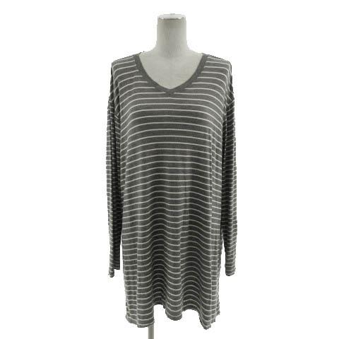 【中古】プラステ PLST カットソー Vネック 長袖 チュニック丈 ボーダー グレー ホワイト 白 M レディース