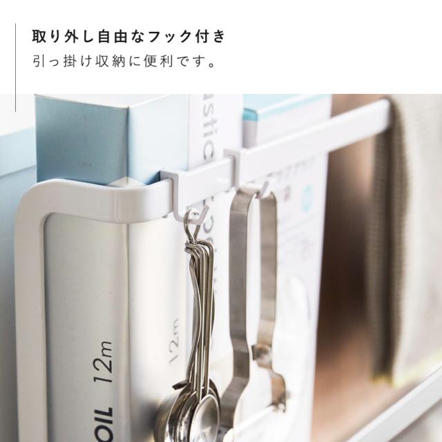 取り外しできるフック2個付き。キッチン小物を引っ掛け収納できます。