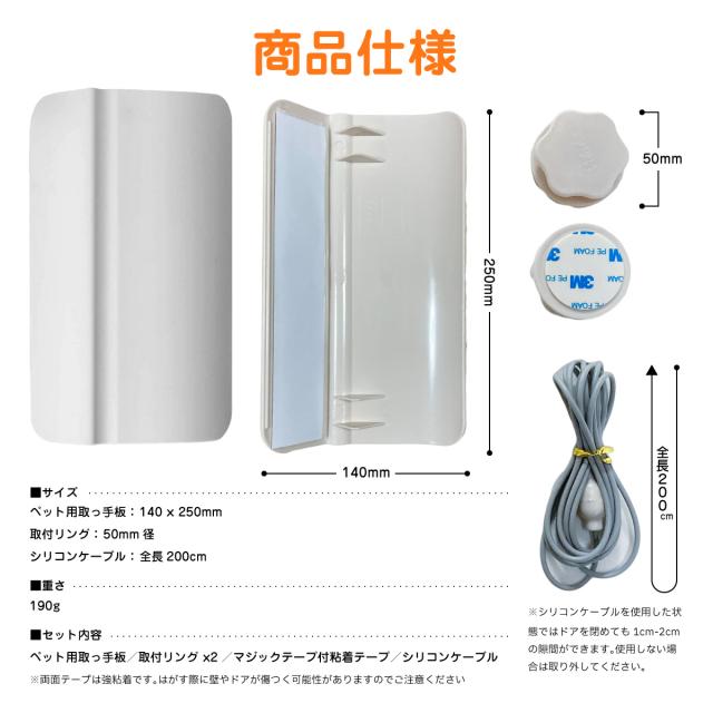 ペット用取っ手板/取付リング ×2/マジックテープ付粘着テープ/シリコンケーブル