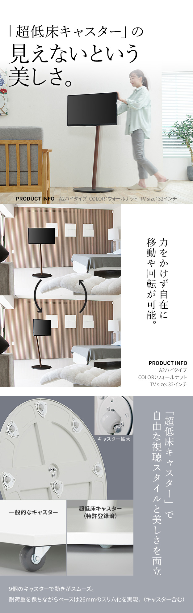 見えないキャスターで移動も楽々 WALL インテリア テレビスタンド A2 ハイタイプ 【送料無料】 キャスター付き 壁寄せ テレビスタンド おしゃれ 大型 高さ調整 丸 スリム