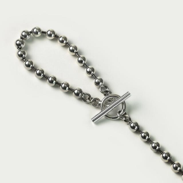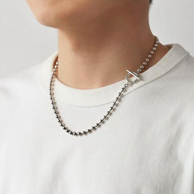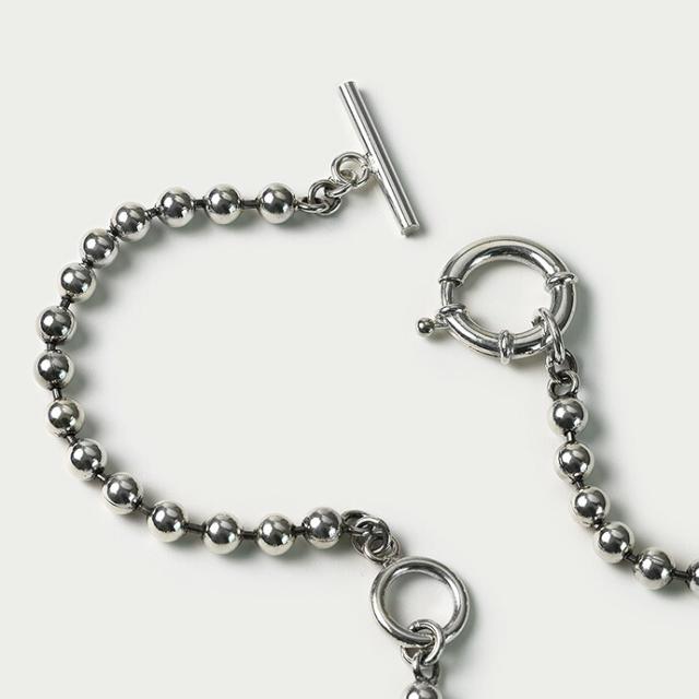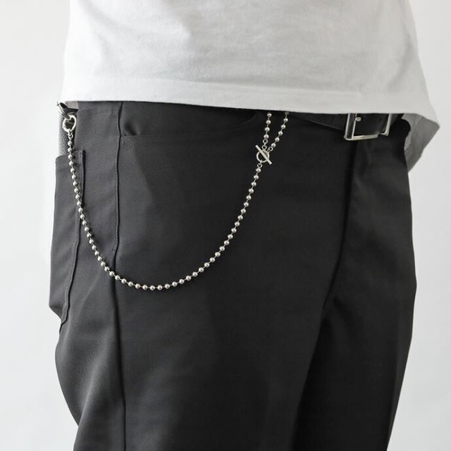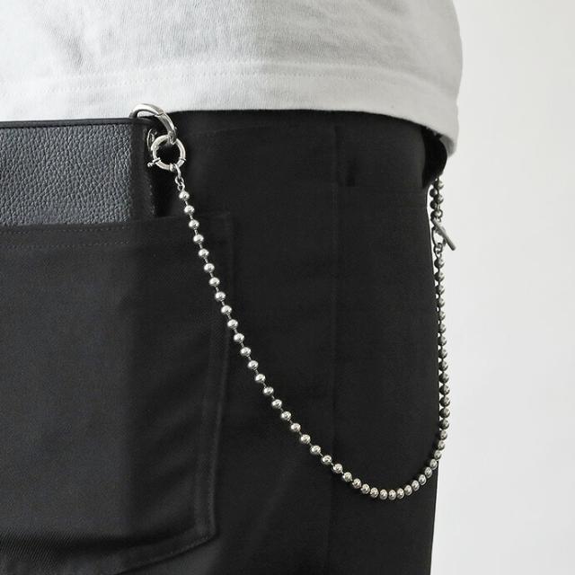 ボールチェーンを使用したシンプルなウォレットチェーン。チェーンの端同士を留めるとマンテルデザインのネックレスとしても使える2WAY仕様です。ベルトループ側にはモードなマンテル留め具を採用。大きすぎず小さすぎない、ちょうどいいサイズ感のボールチェーンは、モードで都会的な雰囲気を演出します。ボールを繋ぐワイヤーに施された燻し加工が全体の印象を引き締めるアクセントに。さりげなく着けられる細め幅で、さらっと着けて様になるおしゃれなウォレットチェーンです。